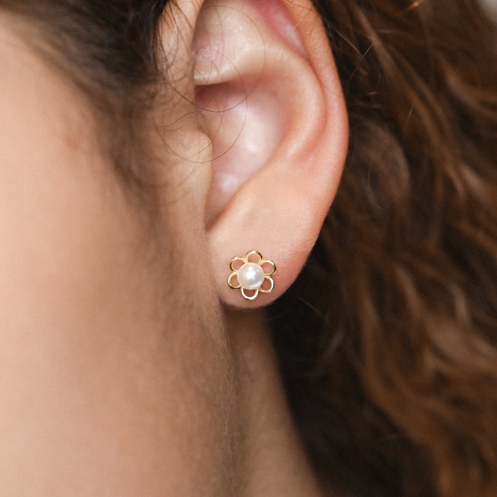 Aretes en forma de flor con perla en el centro. Elaborado en plata bañados en oro de 18k.