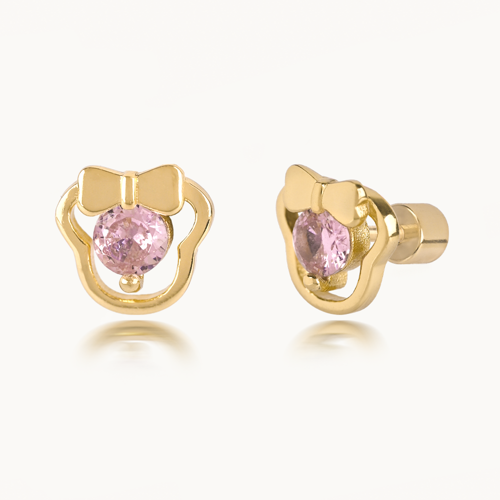 Aretes en forma de minnie con circón rosa. Elaborado en Plata bañados en oro de 18k.