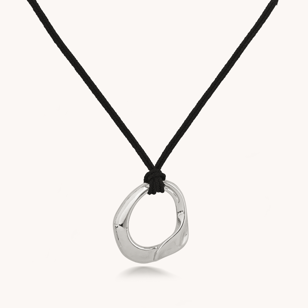 Collar largo con dije circular con textura. Elaborado en cobre bañado en rodio.