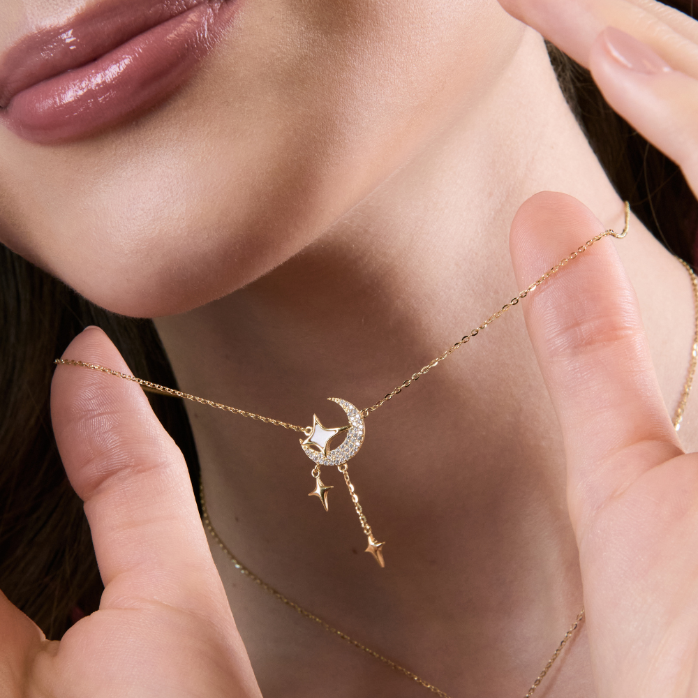 Collar de luna con circones y caída de estrellas. Elaborado en plata bañada en oro.