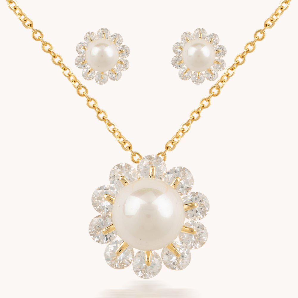 Set con dije y aretes en forma de flor con circones y perla. Elaborado en cobre bañado en oro de 18k.